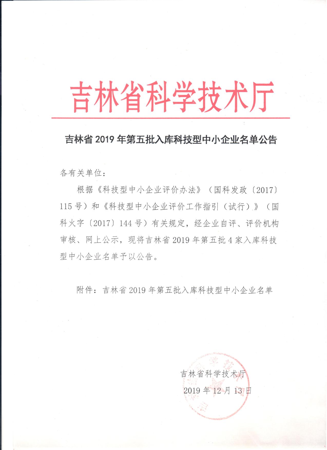 吉林省2019年第五批入库科技型中小企业名单公告