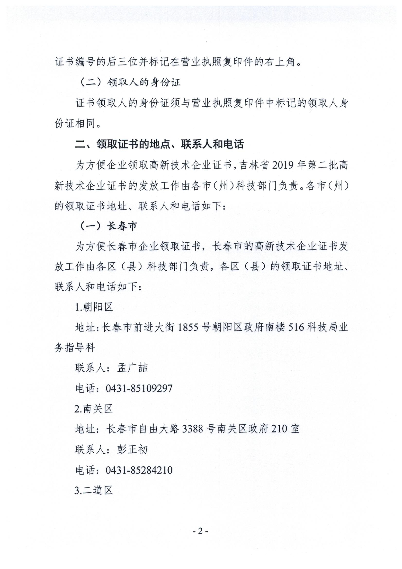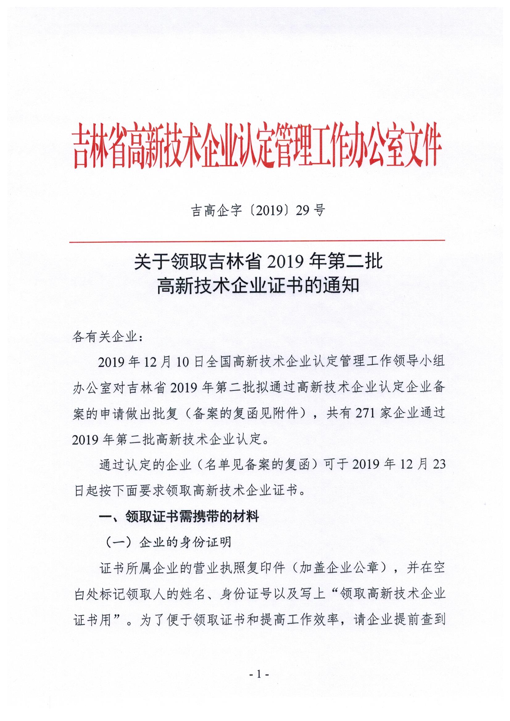 关于领取吉林省2019年第二批高新技术企业证书的通知