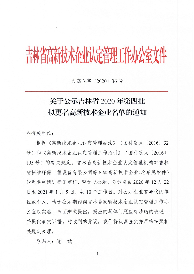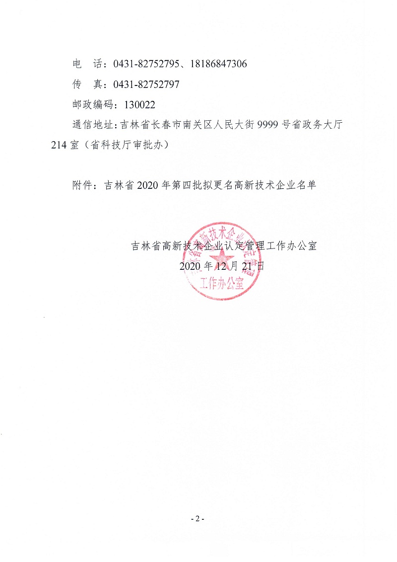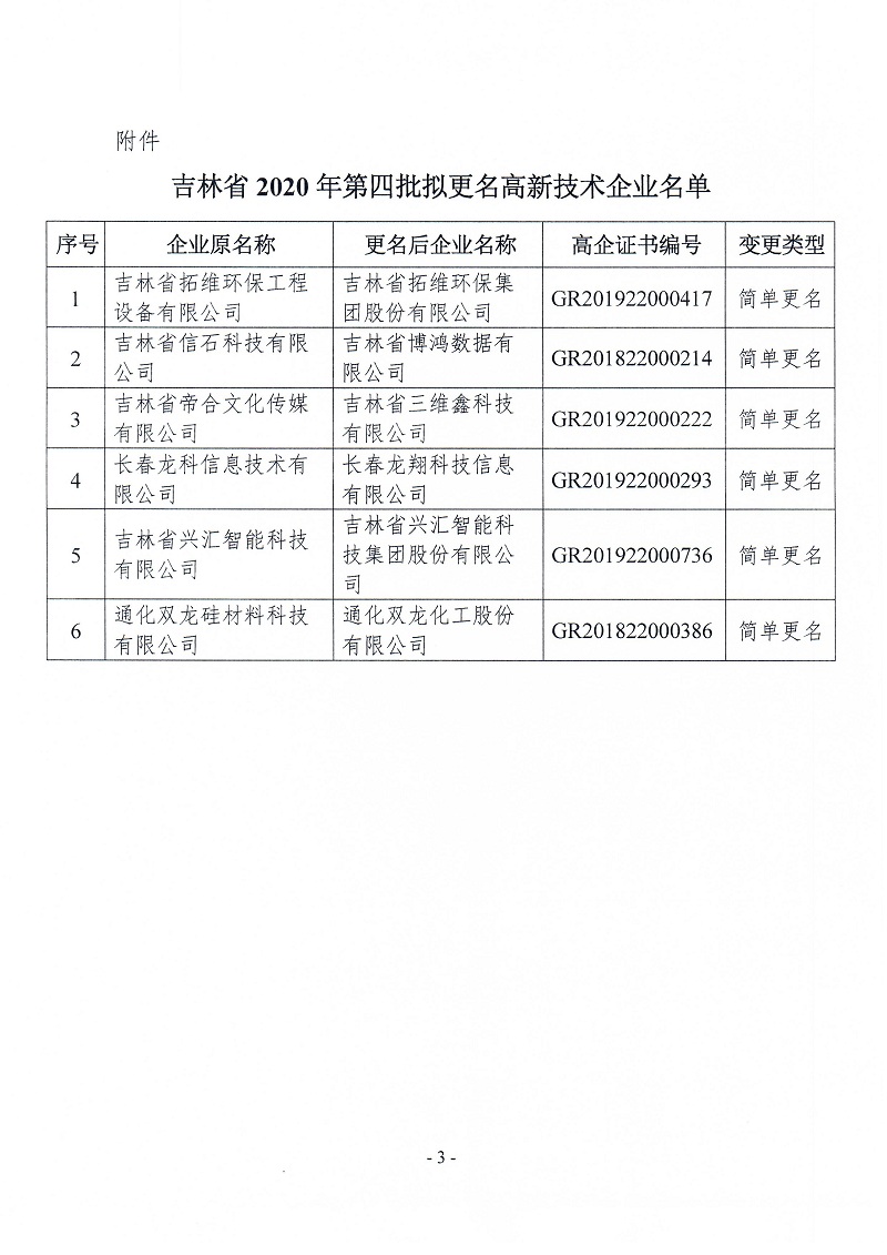 关于公示吉林省2020年第四批拟更名高新技术企业名单的通知